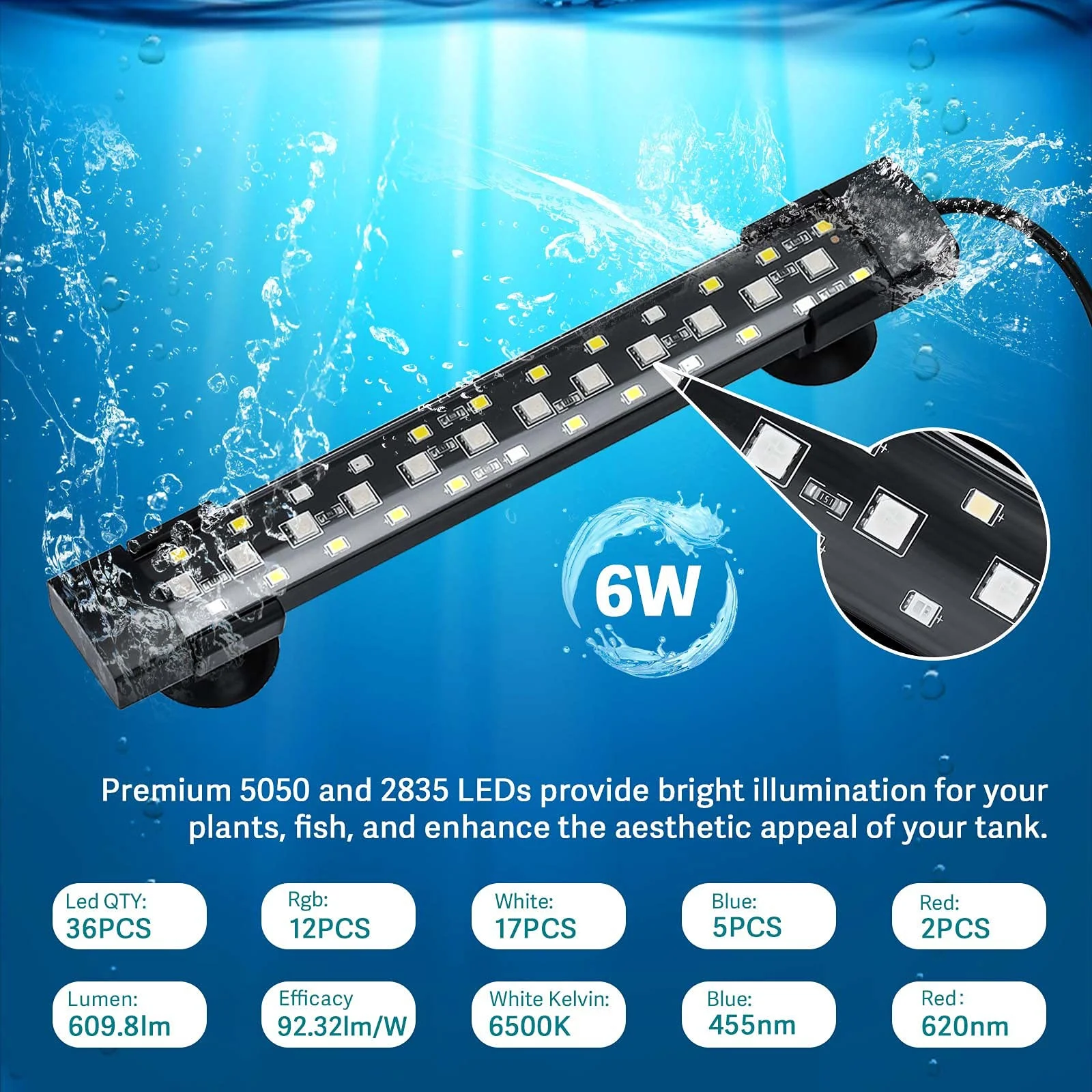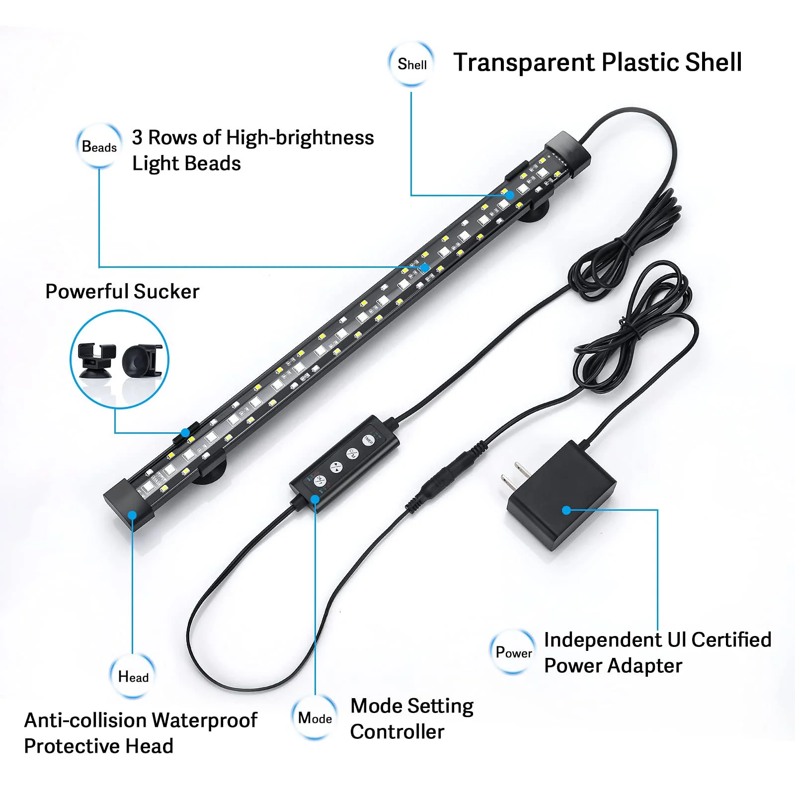 The aquarium light can be firmly installed in various places in the fish tank. It is a diving light that can be placed anywhere in the water in the tank. Even if it is damaged, no need to replace/throw away the whole light to avoid waste, just change the power adapter. Sealed, will not enter water, protect the 2 sides of the light.