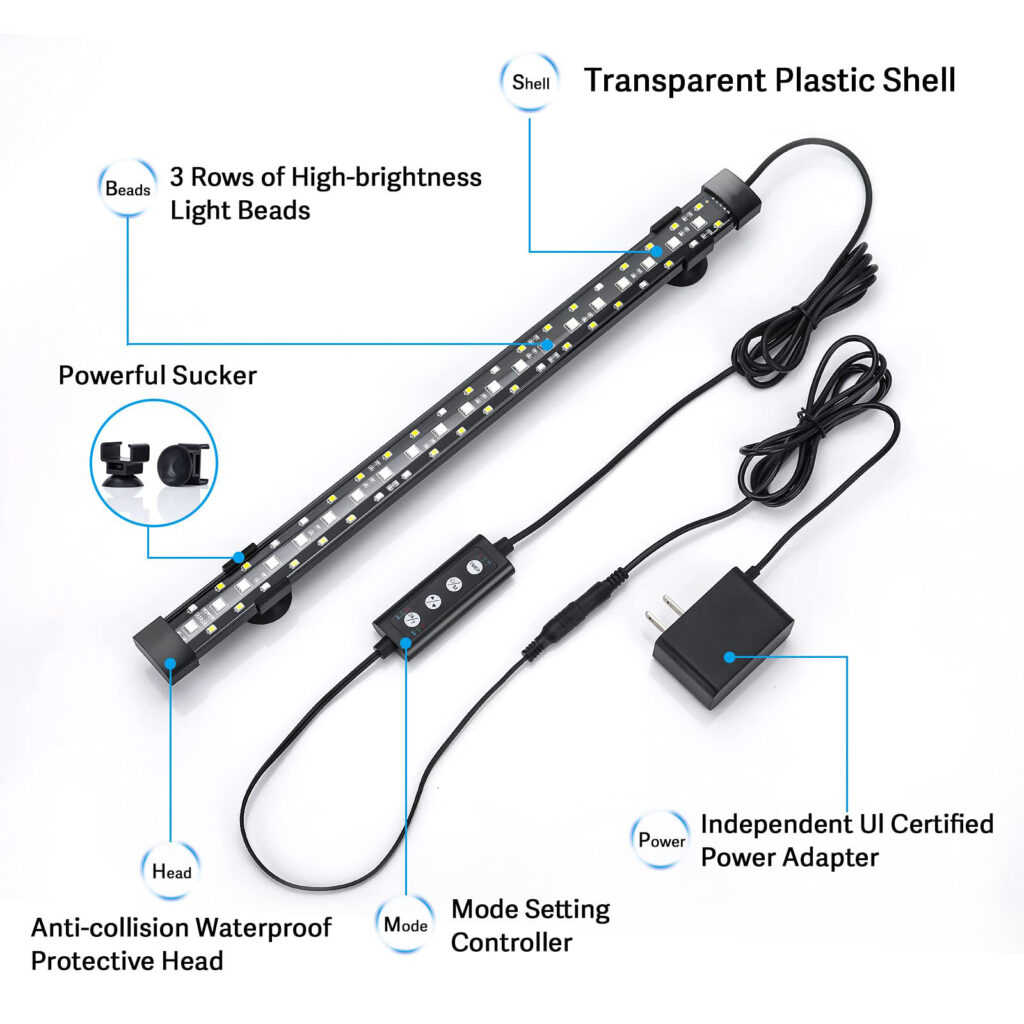 Designed for long-lasting performance, the light uses high-efficiency 5050 and 2835 LEDs with low power consumption. The mode-setting controller allows quick adjustments to brightness, color, and timer settings, while the durable construction protects against water splashes and daily wear. Whether you need a planted tank grow light or a simple fish tank accent light, this Taucken LED offers reliable, eye-safe illumination for any setup.