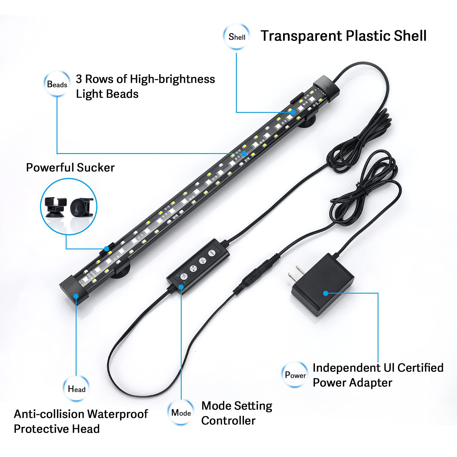 Built with a transparent plastic shell and anti-collision waterproof protective head, this light is fully submersible (IP68 rated) for use underwater or mounted externally. It comes with powerful suction cups for easy, secure installation inside the tank, and its slim, low-profile design can be hidden completely for a clean, unobtrusive look. The independent UI-certified power adapter ensures safe and stable operation.