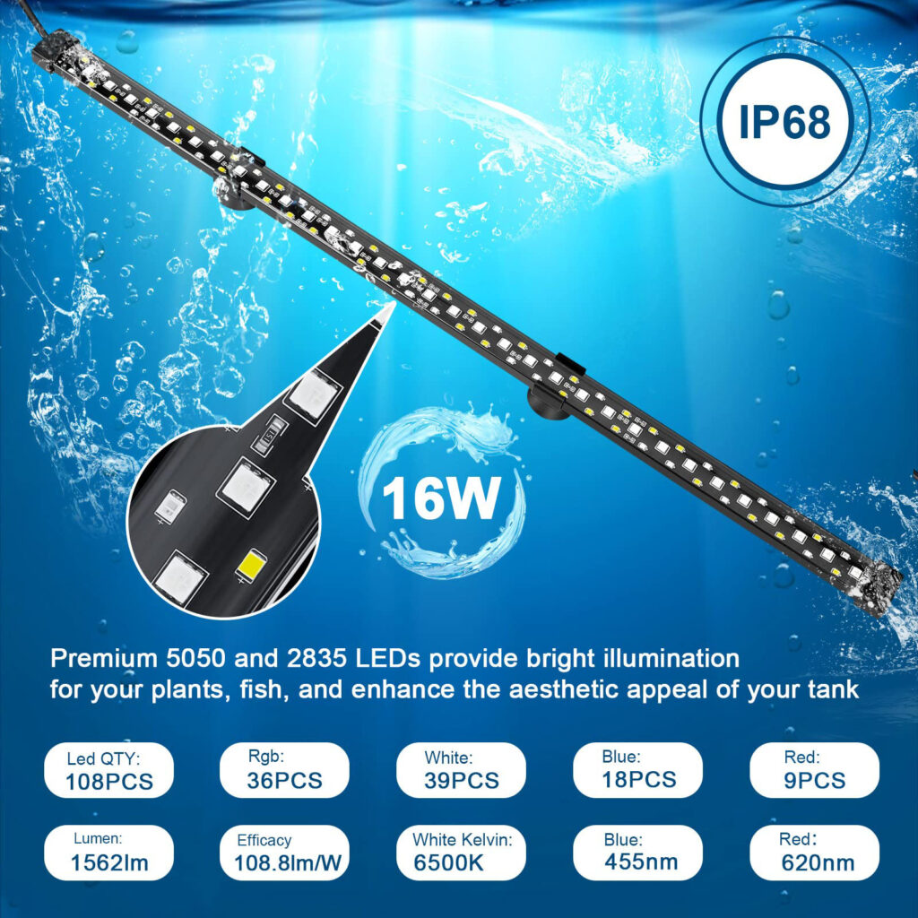 Powered by 108 premium LEDs (39 white, 36 RGB, 18 blue, 9 red), this 16W light delivers 1562 lumens with a 6500K white spectrum, 455nm blue light, and 620nm red light. The plant-optimized spectrum boosts photosynthesis and chlorophyll production, while the full WRGB combination enhances the natural colors of fish and corals, making your tank look vibrant and lifelike.