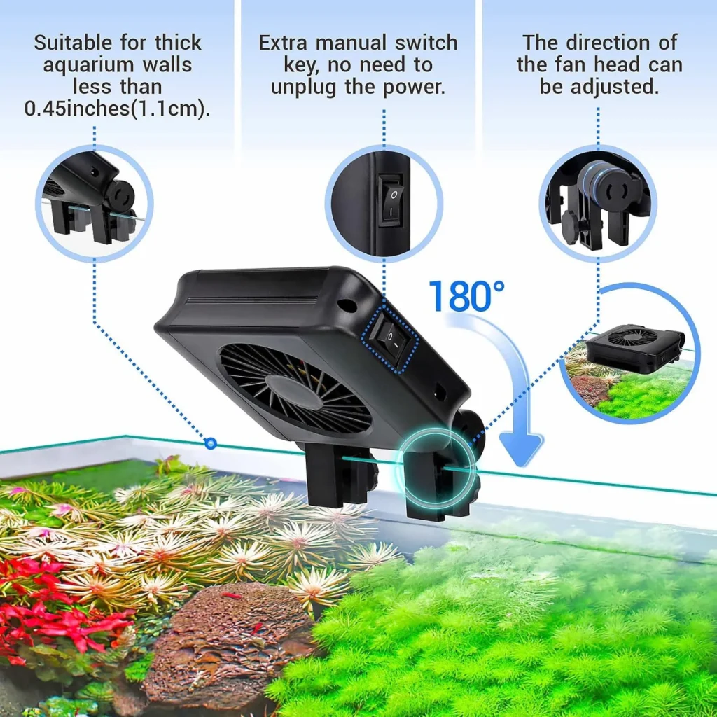 • Easy To Use: Fixed by strong plastic screws, it can be hung on the wall of the fish tank less than 0.45 inches thick, safe and stable. The angle of each independent fan head can be adjusted freely, no need to worry about angle restrictions, you can blow wherever you want.
