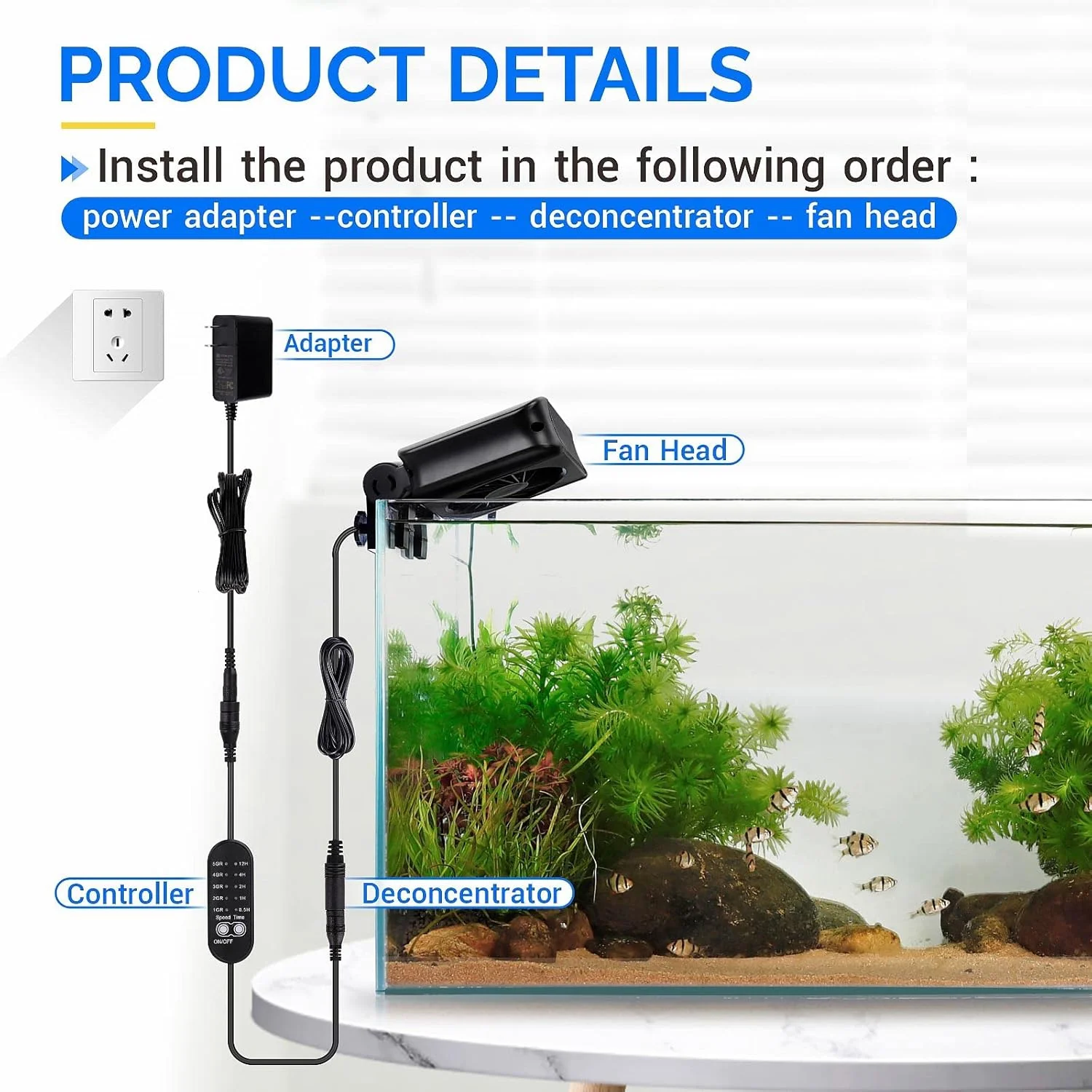 • Auto on/off: Aquarium fan has its own timer setting, which can be selected from 0.5h/1h/2h/4h/12h through an external controller. When the temperature cools down at night, or the refrigeration equipment is turned on, the fan can be stopped during this period of time. It is not necessary to turn it off manually every time. The timer function can perfectly solve this problem.