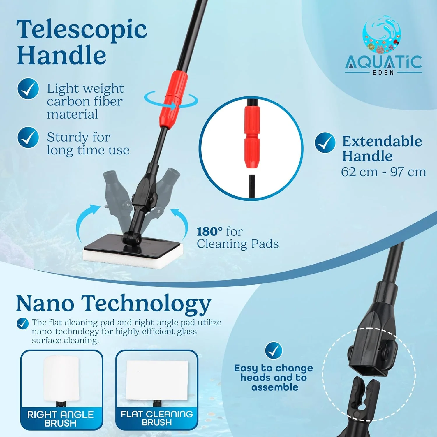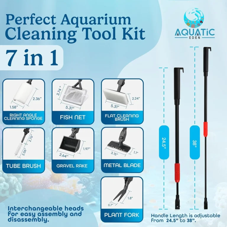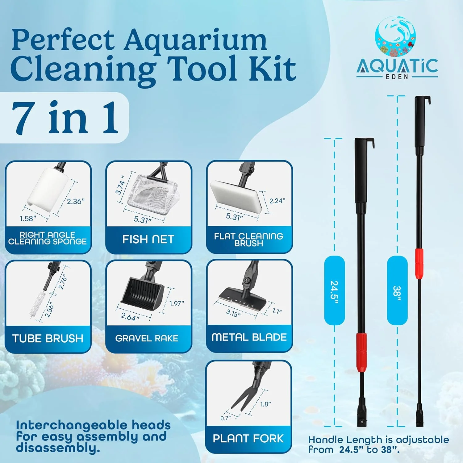 COMPLETE 7-IN-1 KIT: This all-in-one fish tank cleaning kit has everything you need to keep your aquarium spotless! It includes an algae scraper for glass aquariums, scrubber pad, adjustable telescopic handle, fish net, gravel rake, fork, and fish tank brush for easy and effective cleaning.