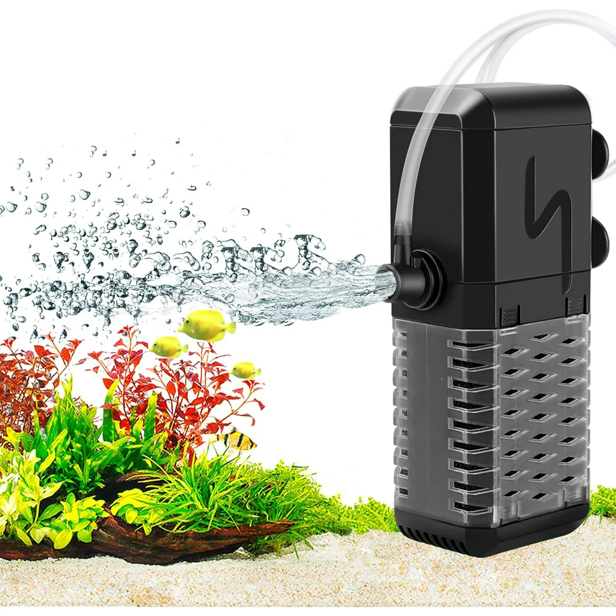 Taucken Aquarium Filter is a powerful 3-in-1 internal system that combines a fish tank filter, water pump, filter pump, and water cleaning filter pump into one compact unit. Featuring both rain and aeration modes, it ensures effective filtration, increased oxygen levels, and smooth water circulation—creating a healthy, vibrant environment for fish, shrimp, and turtles. The dense, fish-friendly intake prevents clogging or injury, while the ultra-quiet motor (≤30dB) keeps your tank peaceful. Easy to assemble and clean, and suitable for both freshwater and saltwater setups. Includes rain pipe, aerator tube, and suction cups for secure installation.