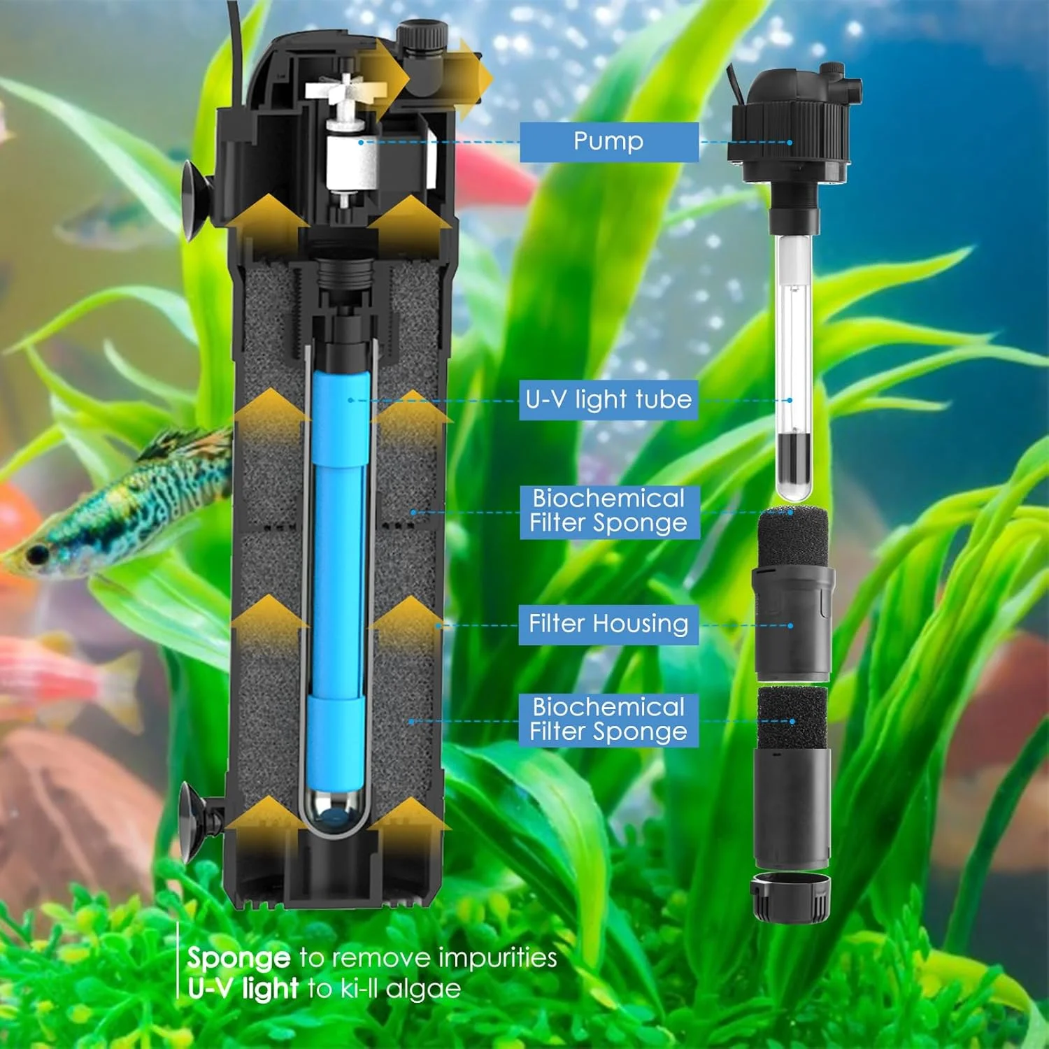 🐟Premium Materials: U-V submersible filter pumps are mainly made of high quality food grade plastic, stainless steel and quartz glass, durable and safe. Easy to operate and install. The built-in 10-watt U-V light bulb helps improve water quality and remove odors, reducing the frequency of water changes, making it easier for you to care for your fish and providing them with a more comfortable, cleaner environment.