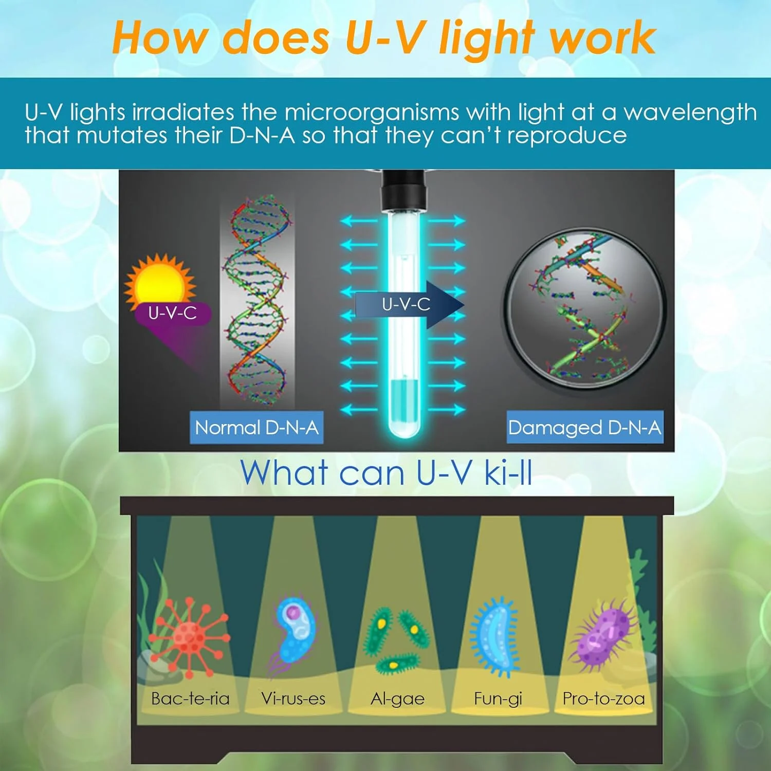 🐟Product Care: Sponge, rotor, outer glass tube should be cleaned regularly; a damp cloth is required for cleaning; you can rinse the sponge with plenty of water; since the life of the U-V lamp is 8000 hours, for best performance it is recommended to use every 8000 hours Replace a light.