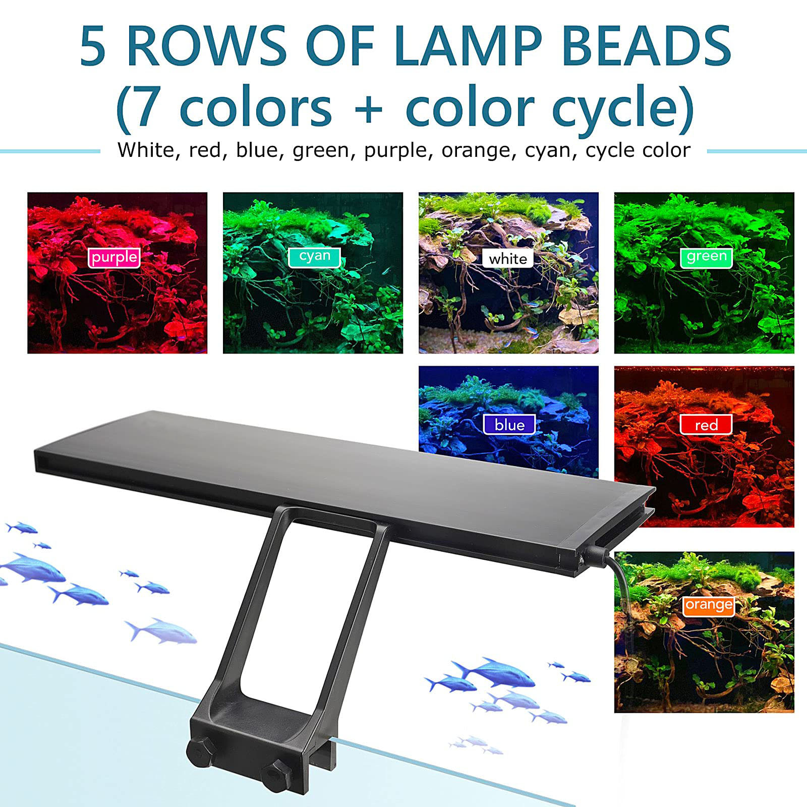 Built with premium 5050 RGB and 2835 LEDs, this  light features 5 rows of lamp beads (7 colors + color cycle mode). Its plant-tailored spectrum includes 6500K white light, 455nm blue light, and enhanced 620nm red light to boost chlorophyll absorption and photosynthesis, promoting lush, healthy plant growth while enhancing the vivid colors of fish. With 817 lumens and a CRI of 85, it delivers bright, true-to-life illumination without harsh flicker, protecting both fish and plants from light stress.