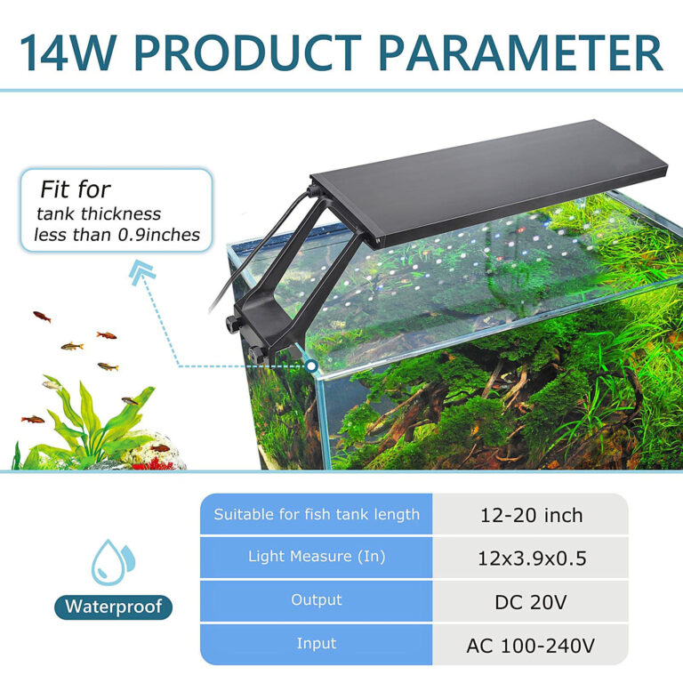 Designed for convenience, the  light features a sturdy clip-on bracket that fits aquariums 12–20 inches long with glass thickness up to 0.9 inches. The compact 12×3.9×0.5 inch fixture sits neatly on the tank rim without obstructing your view. It operates on universal AC 100–240V with DC 20V output, and its water-resistant construction ensures reliable performance in humid aquarium environments.