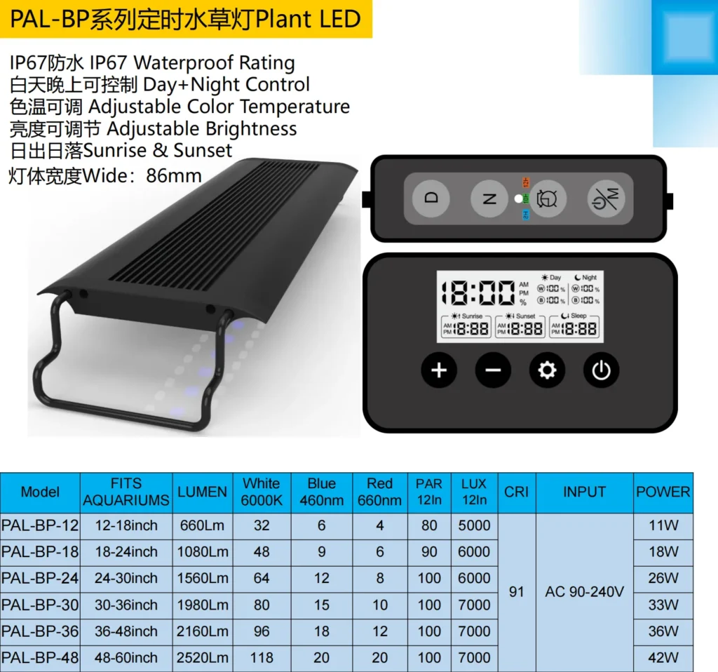 • Brightness: Fine-tune 0-100% intensity for delicate mosses or light-hungry stem plants
