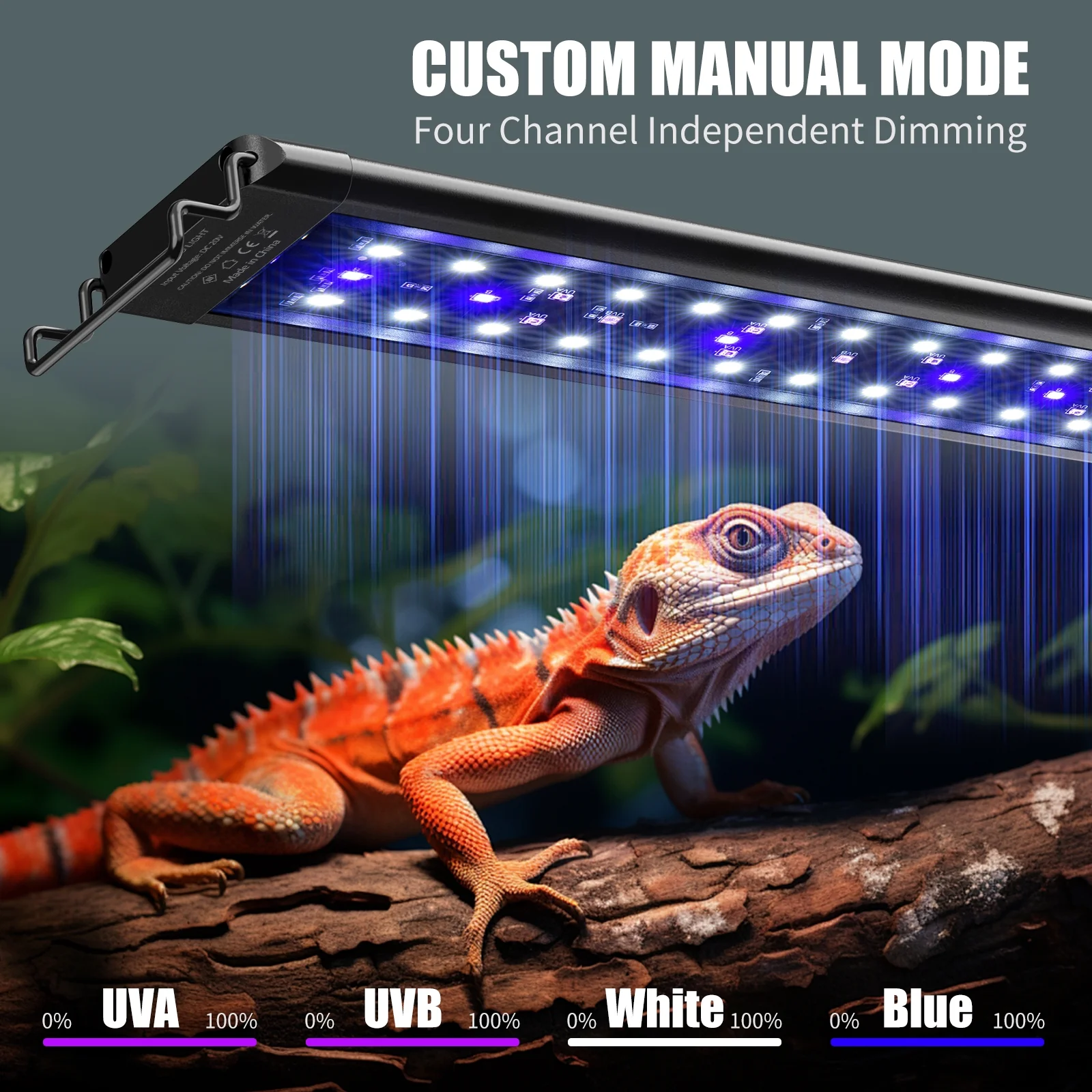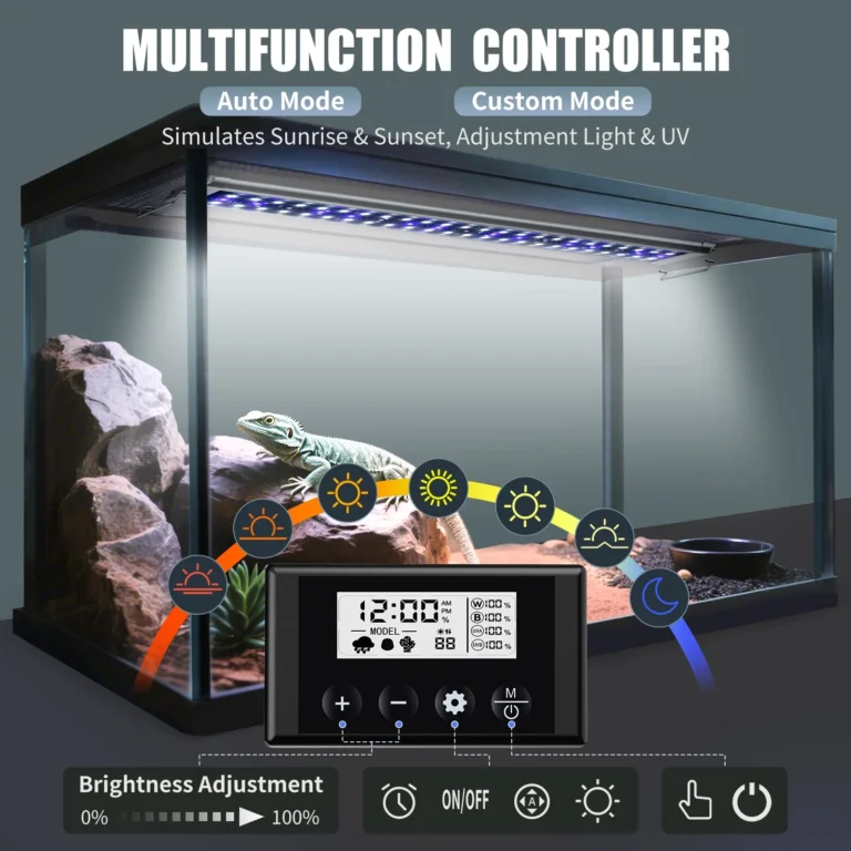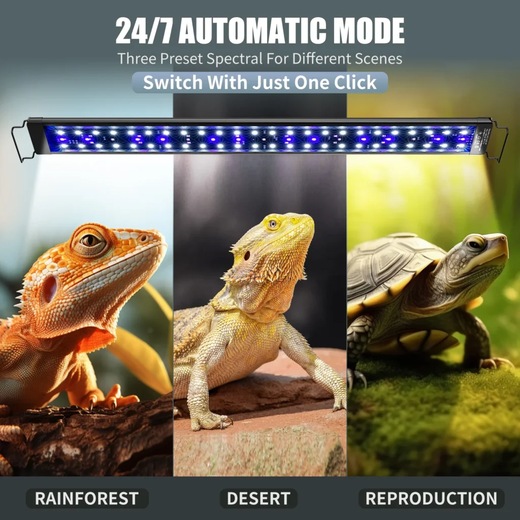 Multi-Mode Options – Featuring three automatic light modes (Rainforest/Desert/Reproduction), this reptile lamp adapts to various environments. Manual mode lets you customize lighting and timing based on enclosure size and your pet’s needs, ensuring a comfortable and natural habitat.