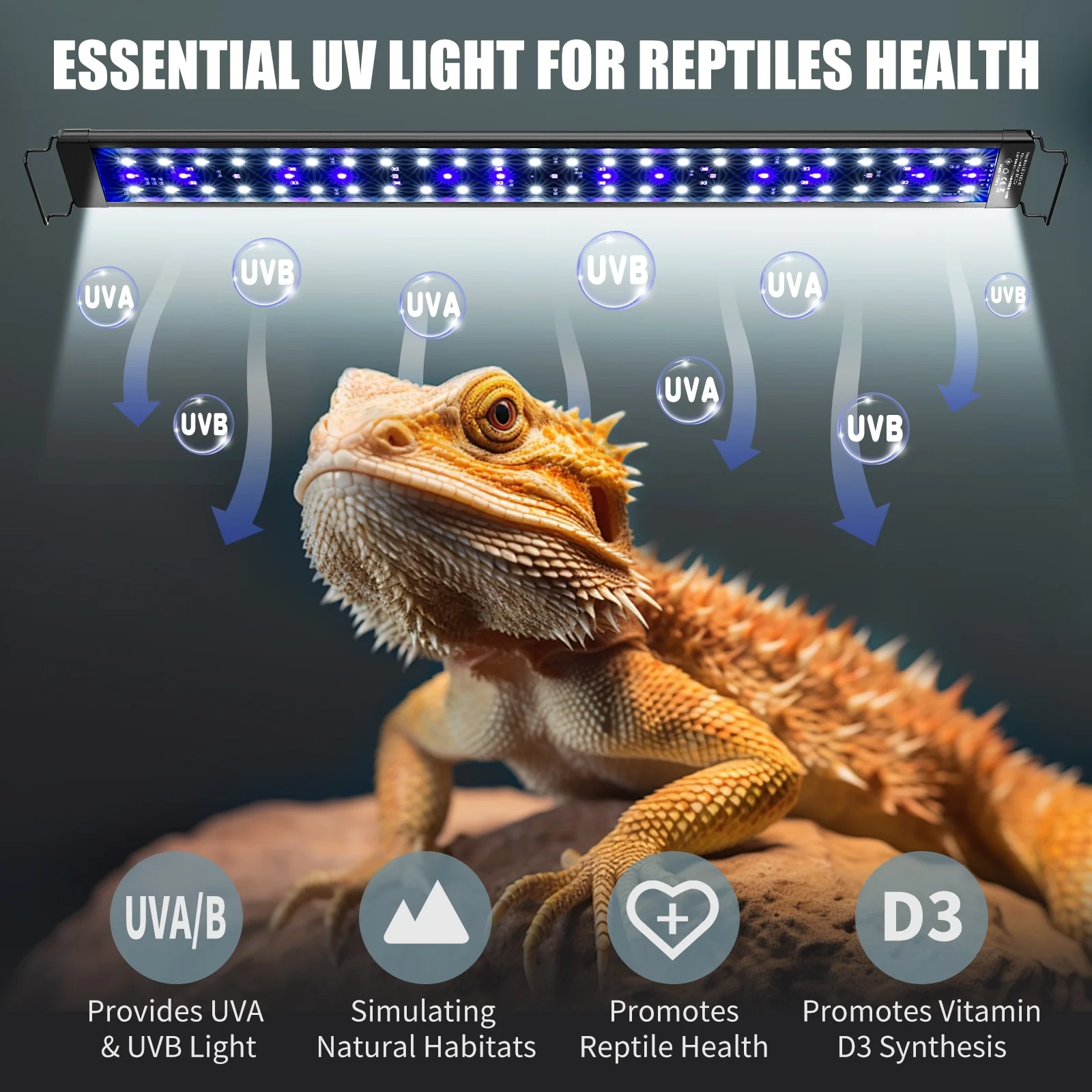 Reptile-Friendly Lighting – This reptile light provides UVA and UVB rays similar to natural sunlight, essential for vitamin D3 synthesis and calcium absorption to support strong bones and overall reptile health. The white and blue LED lights encourage reptile activity while avoiding harmful UVC. Perfect for tropical and desert reptiles.