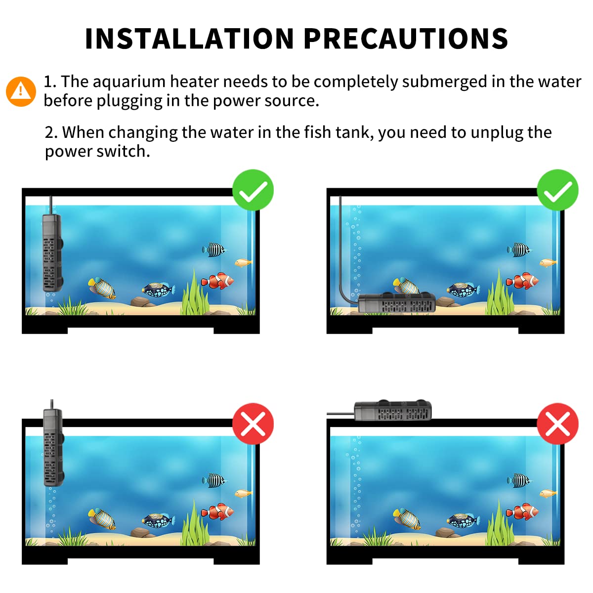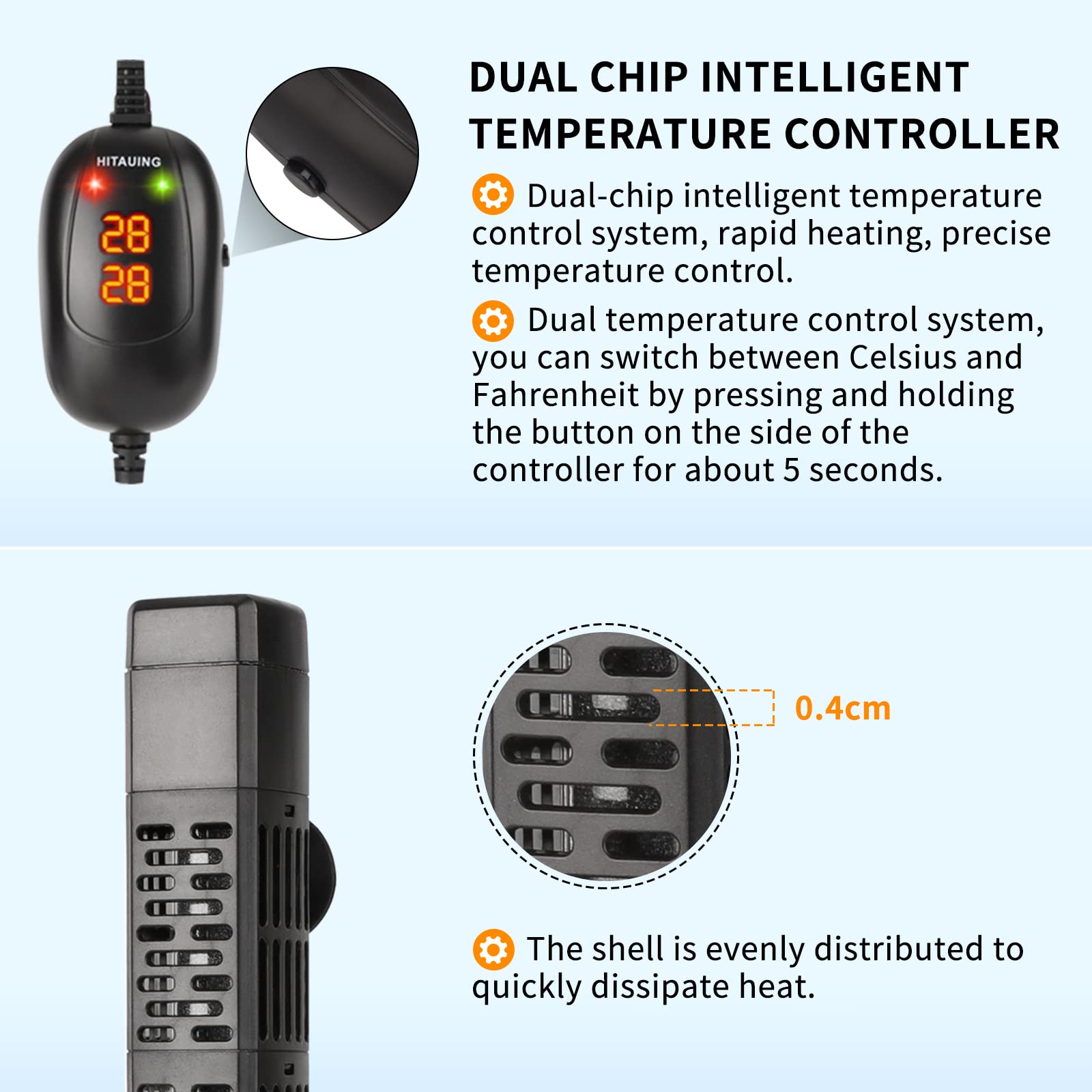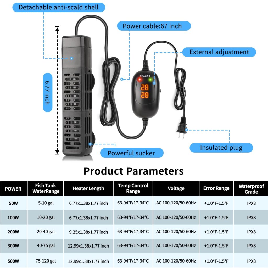 Aquarium Heater, 50W/100W/200W/300W/500W Submersible Fish Tank Heater with Over-Temperature Protection and Automatic Power-Off When Leaving Water for Saltwater and Freshwater