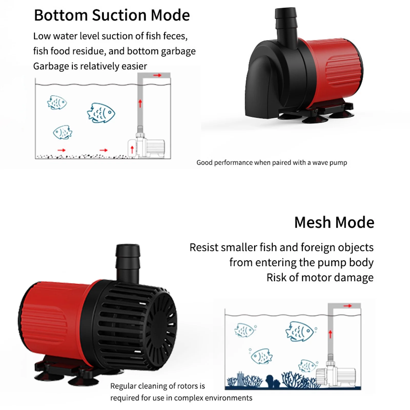 🐟Dual Mode Operation: Bottom suction mode removes debris and fish waste in low water; mesh cover mode keeps tiny fish and particles from entering the aquarium water pump, reducing motor damage risks.